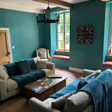 A recently renovated lounge with a stunning fireplace, two large settees and a morning sunlit view of the front lawns. Can comfortable sit 8-10 people.